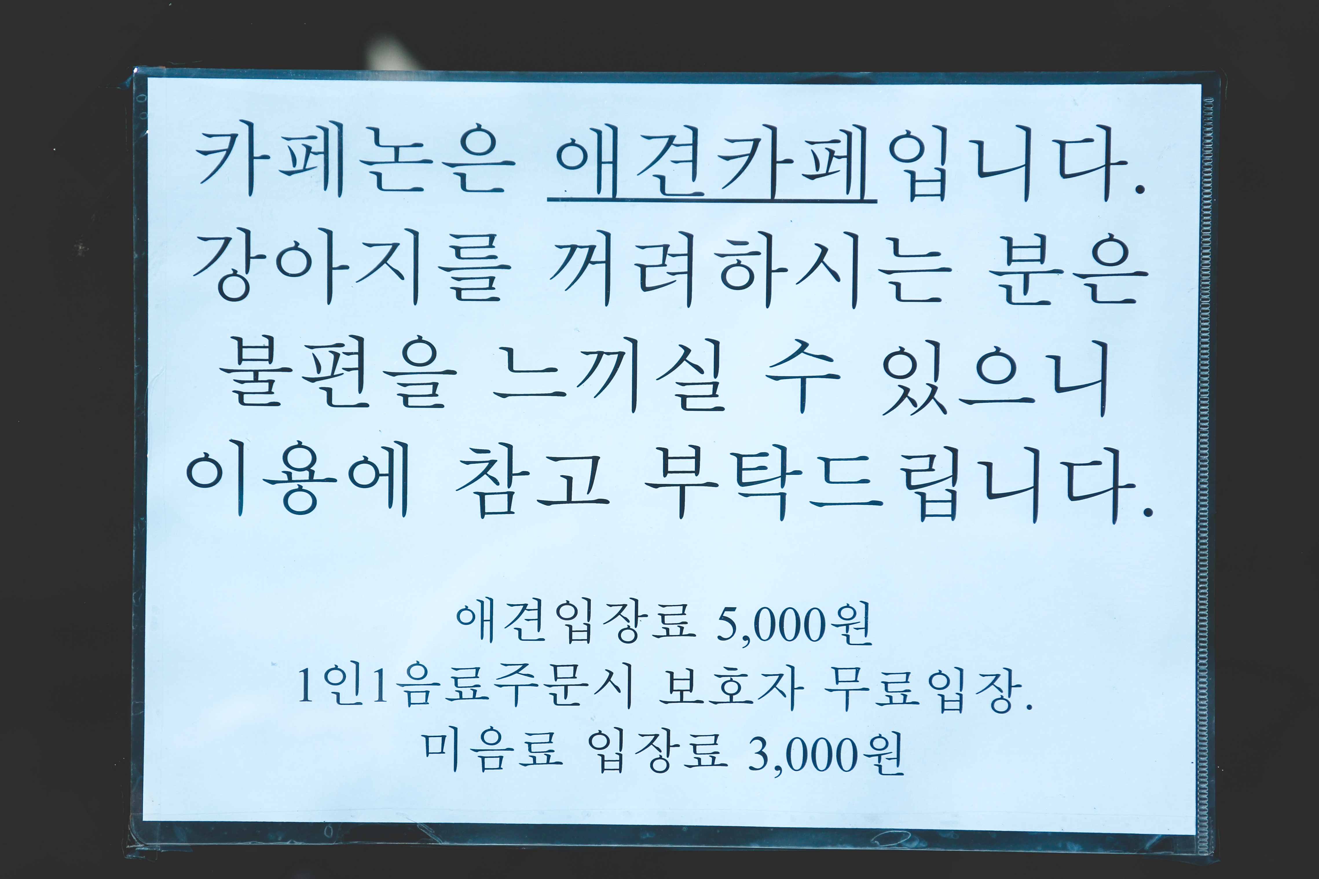 반려견 입장료는 1마리에 5,000원이고 보호자 입장료는 1인 3,000원이지만 음료 주문 시 보호자 입장료는 무료입니다.